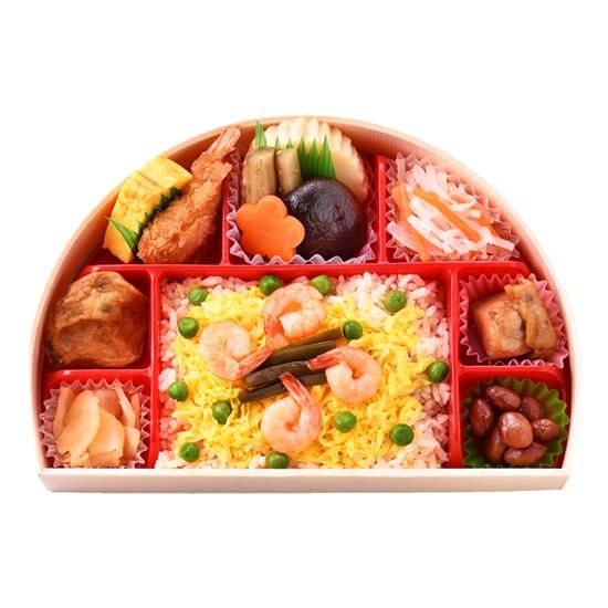 出水沿岸部に当たる東シナ海の不知火沖、300年の歴史を誇る「桁打網(けたうたせあみ)漁」で獲れたクマエビが最高級とされています。藁で縛って吊るされた大焼き海老は鹿児島の年末の風物詩。1尾1000円もする貴重な大焼き海老からは清冽で芳しいだしが取れます。藩主も絶賛したと云われる雑煮にちなみ、赤海老をご飯に炊き込みました。若鶏を素揚げにして、煮含めた「若鶏の揚げ煮」、卵焼き、人参、煮豆など、多彩なおかずとのハーモニーがお楽しみ。